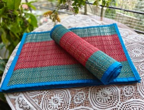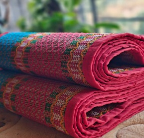 Reeds are harvested in season, dried, and sometimes dyed with natural colours. Weavers work on simple handlooms or frame looms, often at home. The weave is tight and even, creating a flat, durable surface. Larger mats can take days to complete. No machines are used — the rhythm is entirely human. You can read more in our story Madurkathi Weaving: Complete Process.